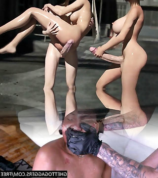 Busty tall and strong ladyboys make lusty submissive dude suck their dicks