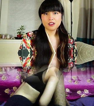 Boss ladyboy in stilettos and pantyhose shows off luxurious soles and cock