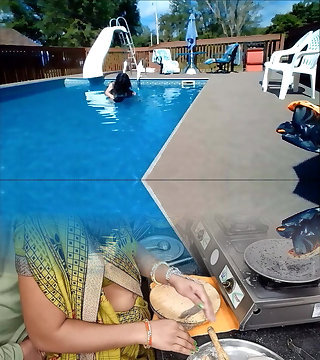 потрясающий транссексуал трахает парня в солнечный день у бассейна