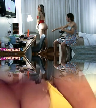 блондинка на брюнетке шелесбиянки играют с камерой и своими шелесбиянскими членами, целуя друг друга и становясь твердыми и