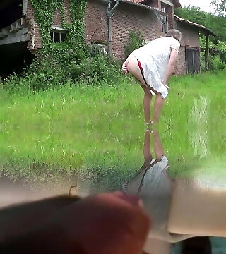 Crazy old crossdresser fapping outdoors by the woods